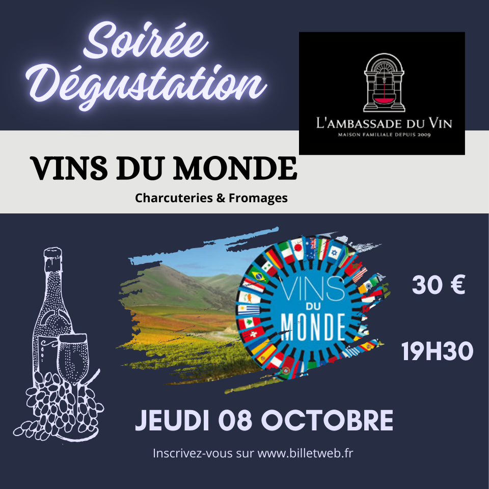 Préparez vos papilles pour un tour du monde des saveurs ! Une occasion unique de vous faire voyager en découvrant des vins du monde et de déguster de délicieux plateaux de charcuteries et de fromages !